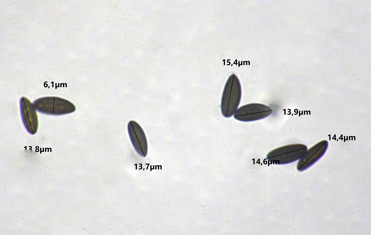 Dunkelbraun bis schwarz transparent (11-16 x 5-8 µm, ellipsoid, eiförmig,