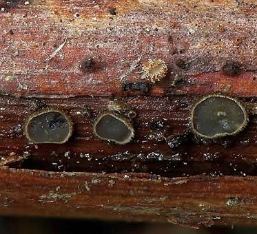 1-3 (4) mm Ø, graubraun, olivbraun, blaugrau, trocken gerunzelt, becherförmig,