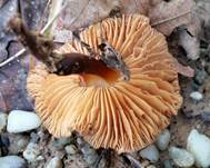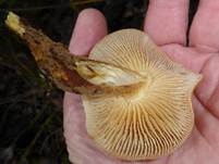 eine hellere, rostfleckige Huthaut. Die Scheibe ist dunkler, er hat weiße,