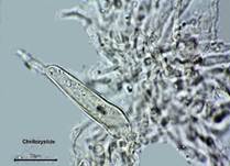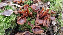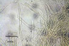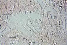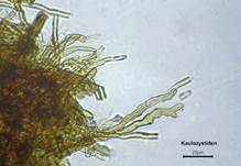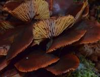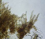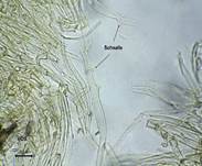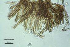Basis dunkelbraun, zäh, faserig, gummiartig (drückt man den Stiel zusammen,