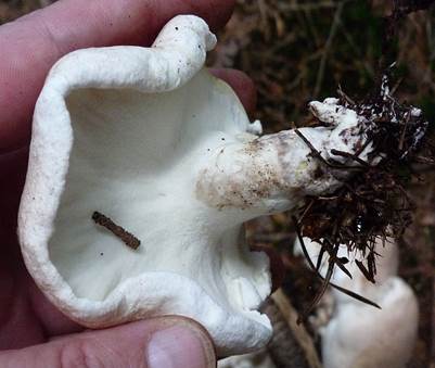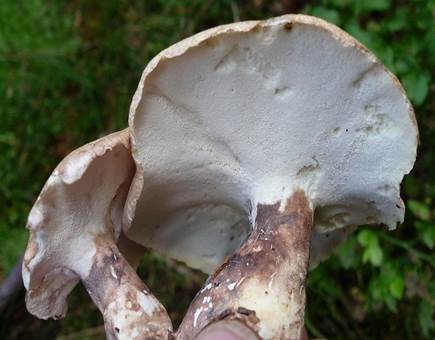 Schafporling: Hutfarbe schmutzig weiß bis bräunlich, Stiel rotbraun