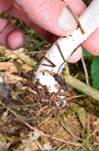 Myzel behaftet und flacher gerandeter Knolle. Spitze ist leicht vom