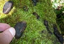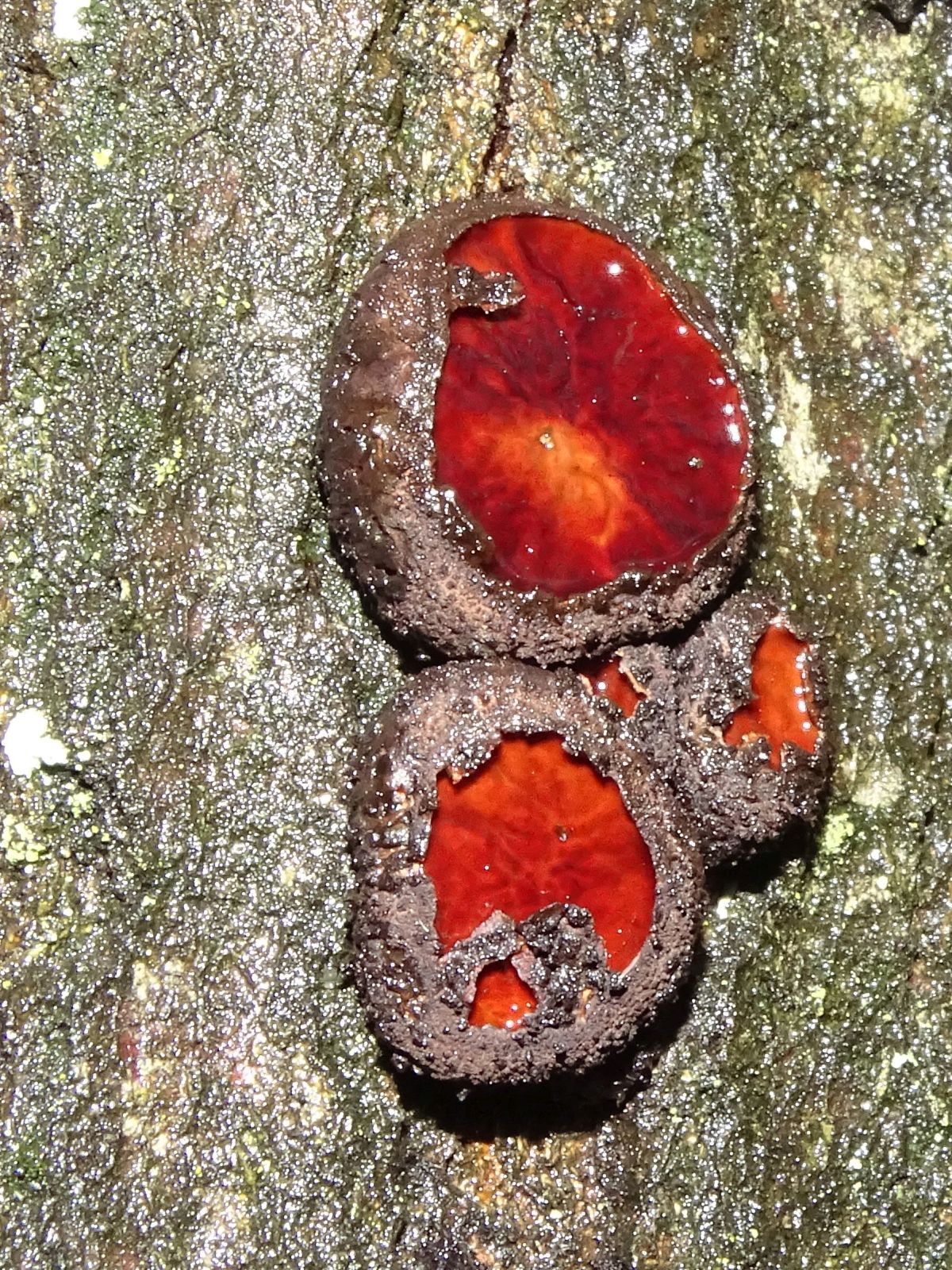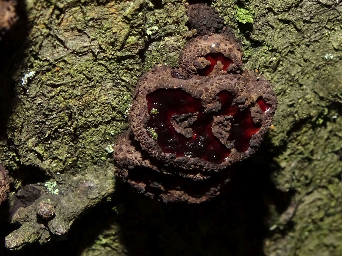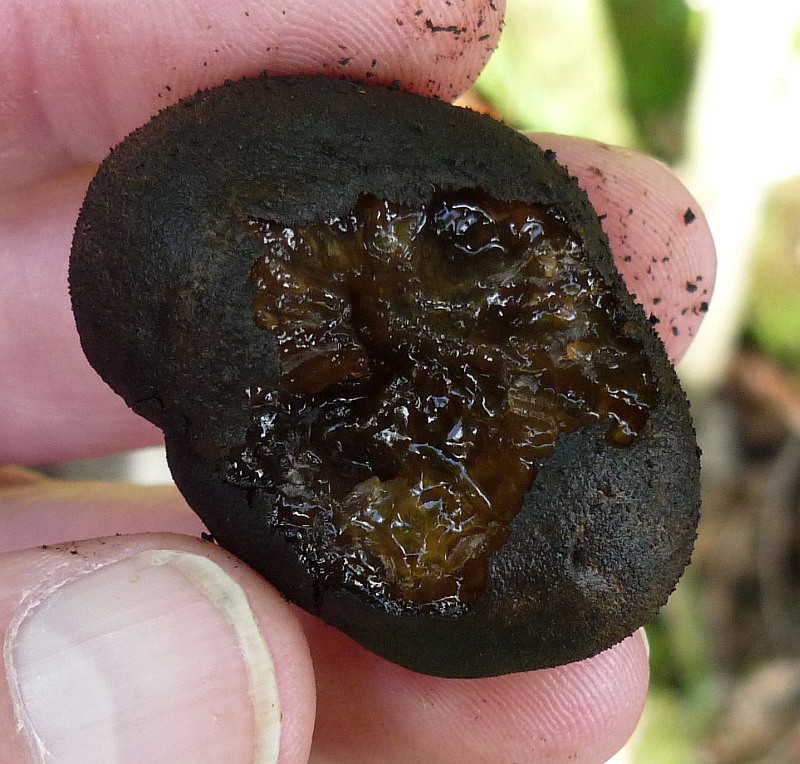 hornartig fest, später schwärzlich-austrocknend. Wiederauflebend bei