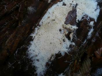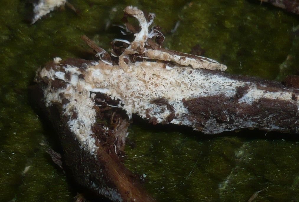 wollig-feinfilzig, resupinat, später zu größeren Flächen zusammenwachsend und