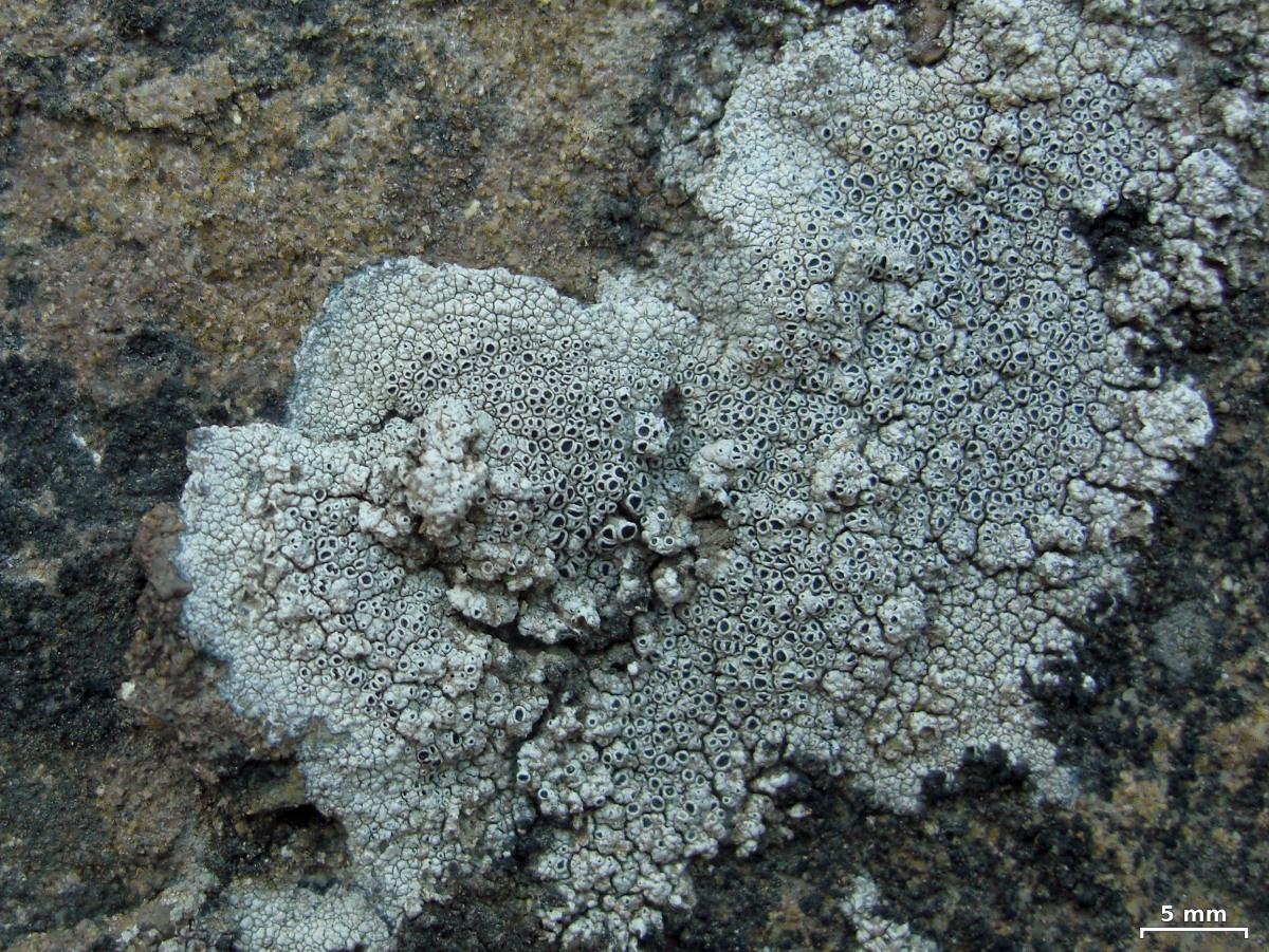 graugrün, körnig bis warzig, oft mit schwarz-scheibigen Apothezien