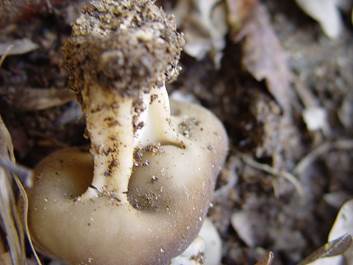Exemplare geben gern durch Berühren des Fruchtkörpers das Sporenpulver frei