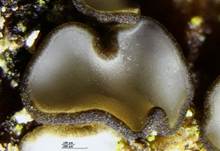becherförmig, zusammengedrückt, Rand dunkler schwarzbraun bis schwarzgrau, im