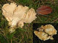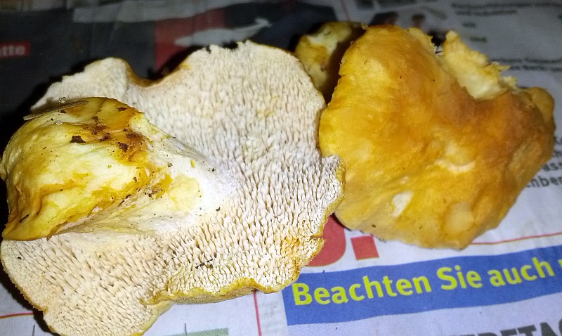 Semmelstoppelpilz (extrem selten), Weißer Semmelstoppelpilz = HYDNUM REPANDUM VAR ALBIDUM (meist größer), Semmelporling oder Schafporling. |