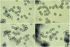 5,5-7 μm, isoliert warzig, rundlich) und mehr bräunlich violette