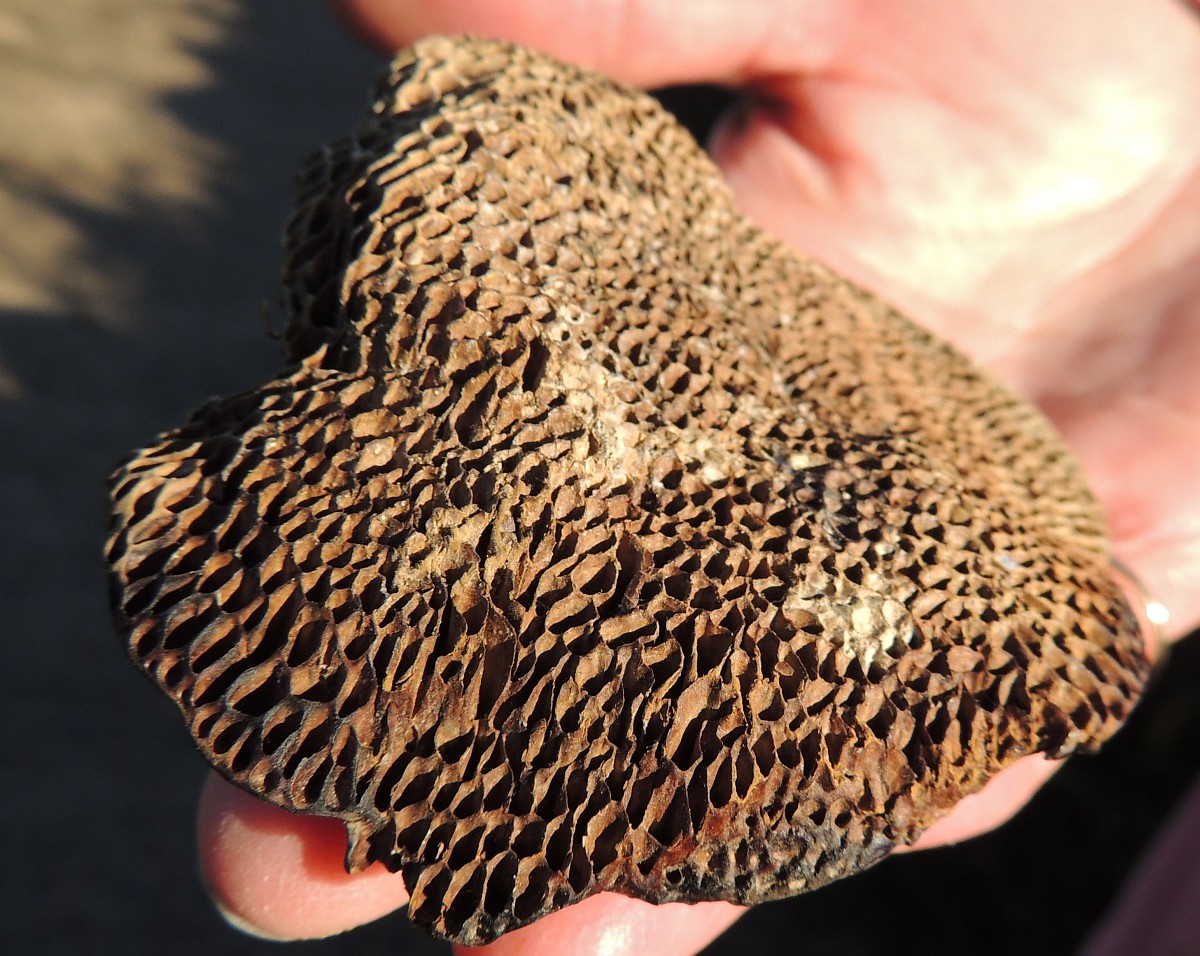 weißlich, wulstig uneben gebuckelt, gezont, Zentrum dunkelbraun, jung