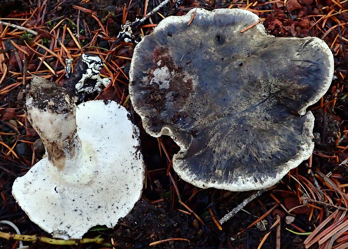 Rußporling hat einen deutlich helleren Hut und Stiel. |