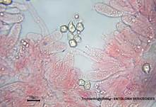 Rotbraun (7,1-9,6 x 6,2-7,9 µm, mit 5-6 abgerundete Ecken, kurze Sterigmen. Caulozystiden fehlen, Cutis aus meist zylindrischen Hyphen mit