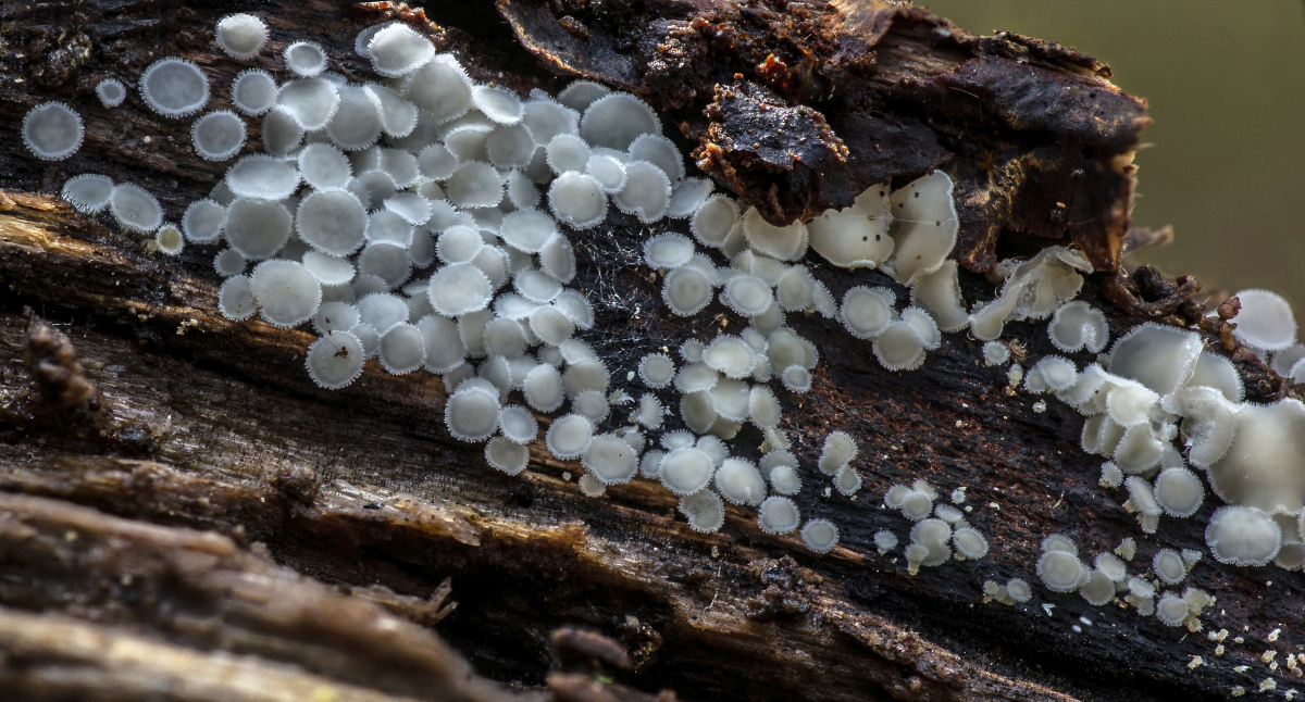 0,4-1 (1,2) mm Ø, weiß bis leicht gelblich, Scheibe: Weiß bis schmutzig gelblich, Außenseite: Weiß behaart, Rand verbogen, anfangs kugelig, später becherförmig, tellerförmig. |