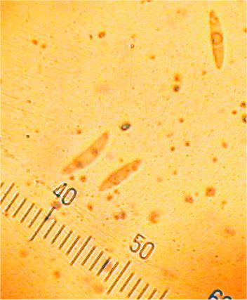 Öltropfen. - LACHNELLULA SUBTILISIMA (Weißtannen-Haarbecherchen): Sporen 5-10 x 1,7-3 µm,