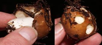 Huthaut zur Hälfte abziehbar, zäh. Oft schieben die festen Pilze Erde und Humus mit und sind deshalb meist