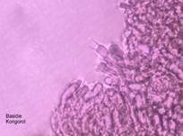 Basidien 18-40 x 4,4-7 µm, viersporig, mit Grundschnallen, meist länglich,