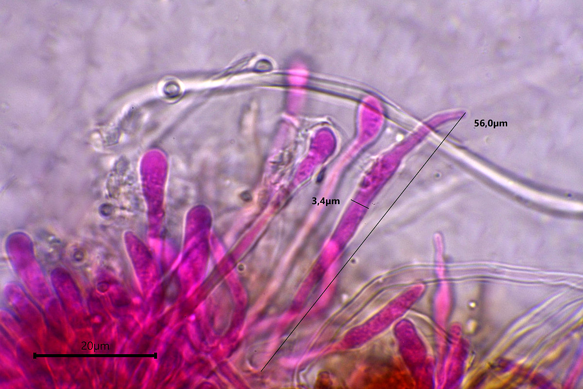 zylindrisch, hyalin, inamyloid, Zystiden sind im Hymenium 25-100 x 3-10 µm,