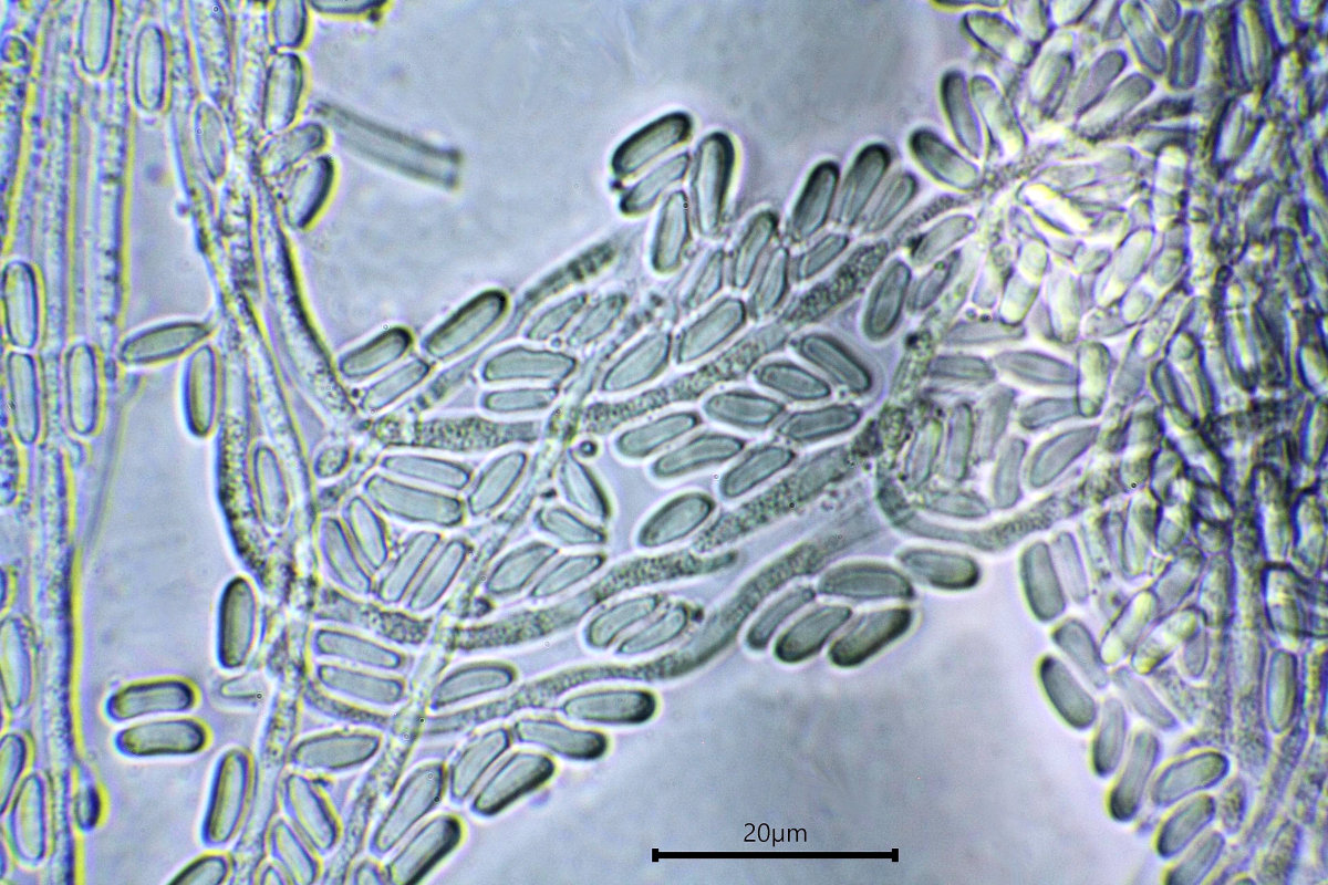 Hellgelb (12-25 x 4-9 µm, glatt, septiert, farblos, Asci 65-85 x 8-10 µm, zylindrisch-keulig, leicht eingeschnürt, sohlenförmig, Konidien der Nebenfruchtform 5-7 x 1,9-2,8 µm sind schmal elliptische bis zylindrisch, +/- leicht gekrümmt). |