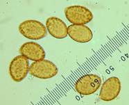 Rostbraun (10-14 x 6-8,5 µm, schwach mandelförmig, breit elliptisch, fein warzig